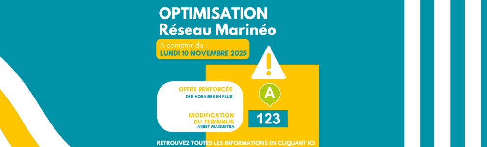 123 Image OPTIMISATION RÉSEAU-LIGNES A et 123 OPTIMISATION RÉSEAU-LIGNES A et 123 Autre effet OPTIMISATION RÉSEAU À COMPTER DU 10 NOVEMBRE 2025 : La Communauté d’Agglomération du Boulonnais et la Compagnie des Transports du Boulonnais vous informent d’une optimisation du réseau Marinéo, à compter du lundi 10 novembre prochain. Marinéo renforce son offre sur la ligne A vers Wimereux avec un doublage de la course depuis l' arrêt "Beethoven" au départ de 8h08 jusqu'à l'arrêt "Saint Joseph"… Plus d'informations
