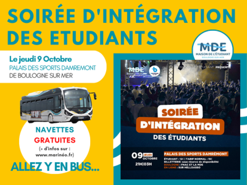 13/09/2023 Navettes gratuites pour la soirée d'intégration Résumé En partenariat avec la Maison De l'Etudiant, Marinéo a le plaisir de vous annoncer que des navettes gratuites seront proposées. Découvrez cette actualité