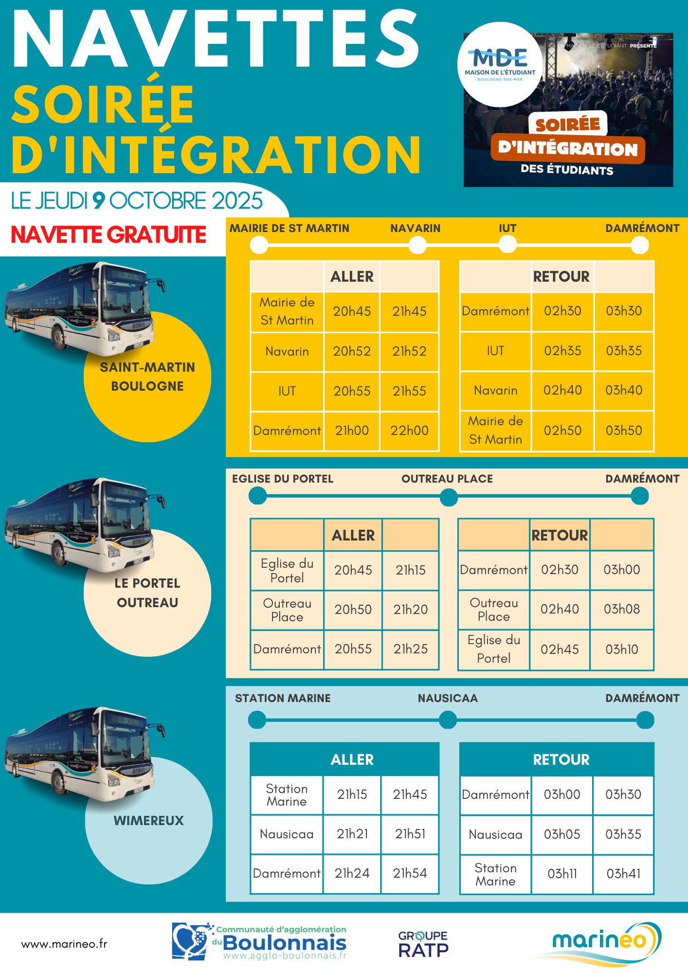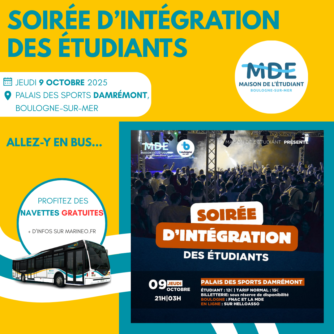 Navettes gratuites pour la soirée d'intégration En partenariat avec la Maison De l'Etudiant, Marinéo a le plaisir de vous annoncer que des navettes gratuites seront proposées au départ des communes suivantes : Le Portel Plage Outreau Saint Martin Boulogne Wimereux. Profitez de ces navettes gratuites, pour vous rendre à la Soirée d'intégration, organisée par la Maison de l'Etudiant de Boulogne sur Mer. Direction le Dancefloor du Palais des Sports Damrémont de Boulogne sur Mer, le jeudi 9 Octobre. ALLEZ Y EN BUS... !