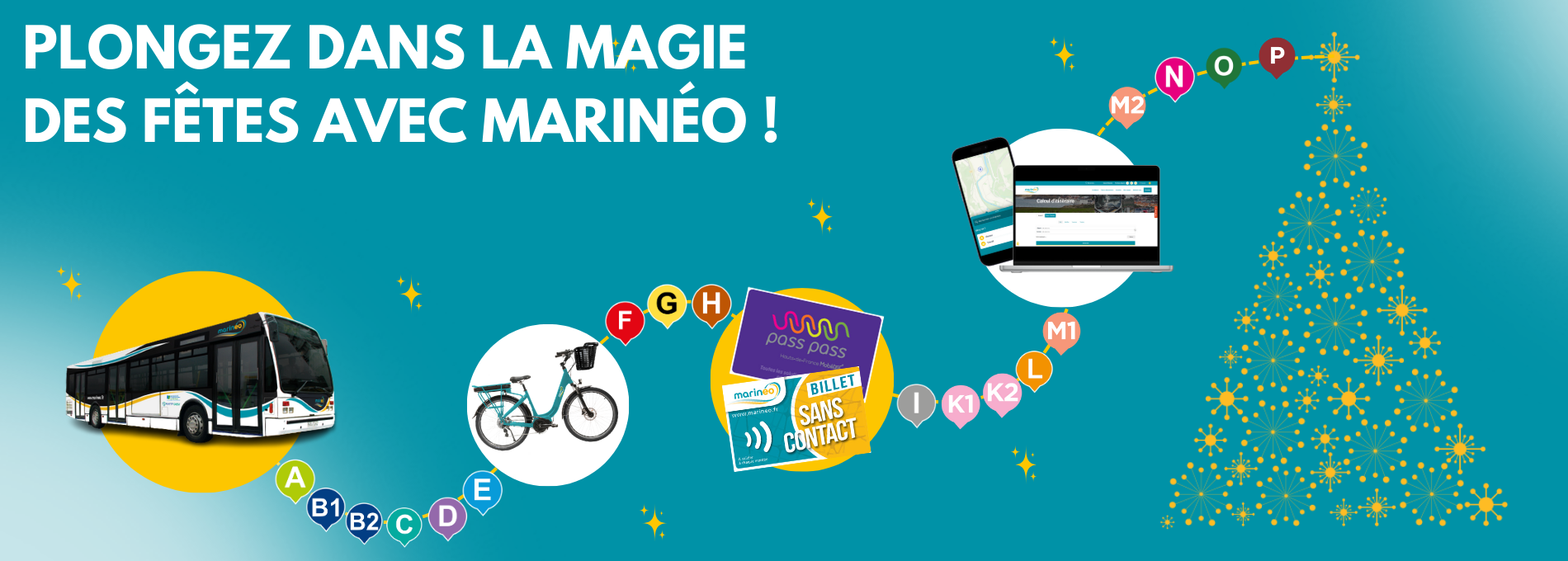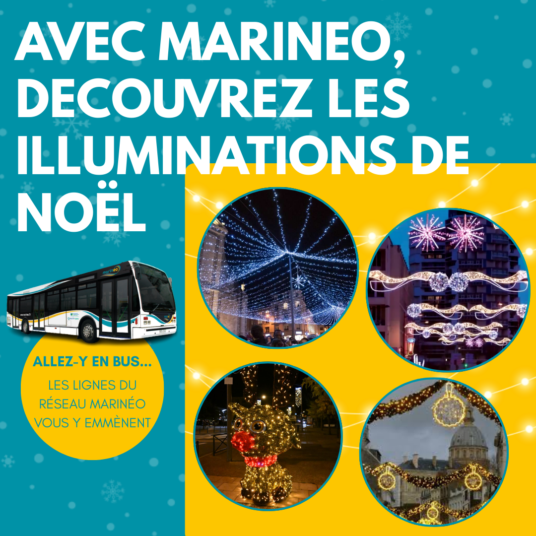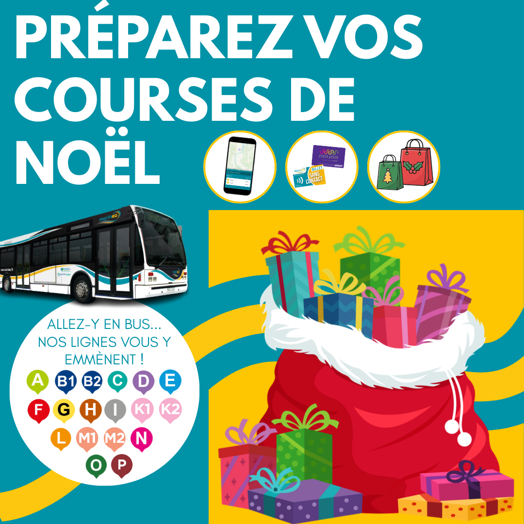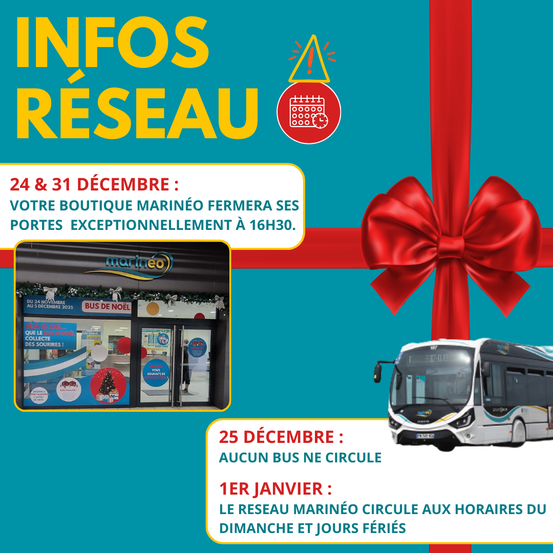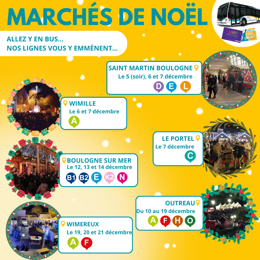 PLONGEZ DANS LA MAGIE DES FÊTES AVEC MARINEO ! À l’approche des fêtes de fin d’année, toute l’équipe de Marinéo vous souhaite à toutes et à tous de très joyeuses fêtes de fin d'année ! Que cette période soit synonyme de bonheur, de partage et de souvenirs précieux avec vos proches. 🎄🚍❤️ Tout au long du mois de décembre, on vous donne rendez-vous sur nos lignes …👇 ✨ Faites de vos achats de Noël un moment de plaisir et de simplicité ! 🎁 Et si vous choisissiez les bus Marinéo pour vos achats de fin d’année ? En empruntant le bus, vous laissez derrière vous le stress du trafic et des places de parking, tout en faisant un geste pour la planète. 🌍💚 Découvrez notre réseau Marinéo qui vous conduit directement aux principaux centres commerciaux et marchés de Noël. Que vous soyez à la recherche du cadeau idéal ou simplement en quête de l’ambiance festive, le bus est votre compagnon idéal ! Et surtout, n’oubliez pas que prendre le bus, c’est aussi profiter d’instants chaleureux et conviviaux avec vos proches. Alors, embarquez et laissez la magie des fêtes vous transporter ! 🎉 🎄 Marchés de Noël ! 🎄 Préparez-vous à vous immerger encore plus dans la magie des fêtes et l’esprit de Noël avec le réseau Marinéo !🎄🎅 Les marchés de Noël s’installent dans toute la Communauté d’Agglomération du Boulonnais ! De Boulogne-sur-Mer à Outreau, en passant par Le Portel, Equihen-Plage ou Saint-Martin-Boulogne, et encore de Wimereux à Wimille, partez à la découverte des chalets, lumières et saveurs de saison… sans vous soucier du stationnement ni des embouteillages avec Marinéo : Saint-Martin-Boulogne : les 5 (en soirée), 6 et 7 décembre, salle de sport André Condette et square Isabelle Nacry. Wimille : le samedi 6 décembre (14h-19h) et le dimanche 7 décembre (10h-19h), à l’espace Médiathèque/Jean-François Pilâtre de Rozier. Le Portel : le 7 décembre, de 10h à 18h à la salle Georges Carpentier. Boulogne-sur-Mer : les 12, 13 et 14 décembre, sur le parking de l’Enclos de l’Évêché, au cœur de la vieille ville. Outreau : du 10 au 19 décembre, sur la place de la Mairie. Horaires : de 15h30 à 20h (du lundi au jeudi) et de 10h à 21h (du vendredi au dimanche). Wimereux : les 19 (15h-21h), 20 (10h-21h) et 21 décembre (10h-19h), aux salons et jardins de la Baie Saint-Jean. 🚌 Profitez de nos lignes régulières pour rejoindre facilement tous les marchés de Noël et laissez-vous transporter dans l’esprit des fêtes ! ✨ Consultez les horaires et itinéraires sur www.marineo.fr 🎁 Astuce : pensez à votre titre de transport à la journée pour voyager en illimité sur l’ensemble du réseau. Faites rimer mobilité, convivialité et féérie, et cette année, laissez votre voiture au repos ! ✨Balades illuminées ! 🤩 Laissez-vous séduire par la féérie des illuminations et des décorations de Noël qui illuminent les rues ! Petits et grands, c’est l’occasion idéale de monter à bord de nos bus et de partir à la découverte des charmantes communes du Boulonnais. Au fil d’une balade nocturne, laissez-vous émerveiller par les jeux de lumières, les sapins scintillants et les vitrines décorées avec soin. Un véritable voyage au cœur de la magie de Noël, à partager en famille ou entre amis ! Alors, enfilez votre manteau, prenez place à bord, et offrez-vous un moment inoubliable sous les étoiles de décembre. INFOS PRATIQUES 🚍 Nous vous informons que notre boutique fermera exceptionnellement ses portes à 16h30 les mercredis 24 et 31 décembre, à l’occasion des soirées de réveillon. 🎁🎉 25 Décembre : Attention, pour rappel, aucun bus ne circule le 25 décembre. 1er Janvier : En raison du jour férié, ce jeudi 1er janvier, les bus du réseau Marinéo circulent avec les horaires du dimanches et jours fériés. Merci de votre compréhension et joyeuses fêtes à tous ! 🎅🌟 🚌✨TOUTE L'ÉQUIPE MARINÉO VOUS SOUHAITE DE JOYEUSES FÊTES ! 🎁🎉