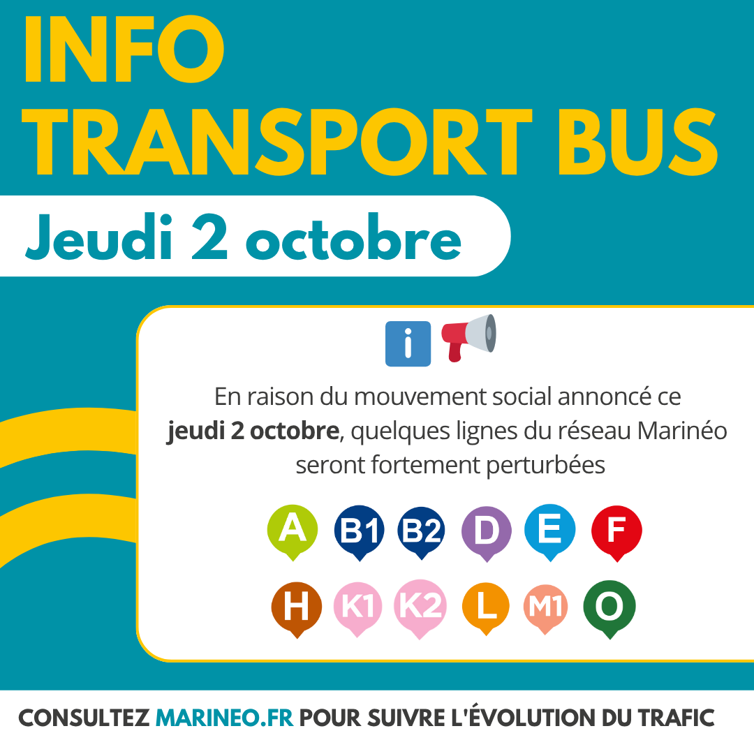 INFO TRANSPORT BUS - JEUDI 2 OCTOBRE 📢 Information voyageurs ℹ️ En raison du mouvement social annoncé pour ce jeudi 2 octobre, l'ensemble des lignes du réseau Marinéo seront fortement perturbées pouvant engendrer des retards ainsi que des déviations inopinées selon les conditions de circulation sur l'ensemble du réseau Marinéo. RETROUVEZ LE GUIDE HORAIRE DES COURSES SUPPRIMÉES : "Guide spécial horaires du 2 octobre 2025" Restez connectés : 👉Nous vous invitons à consulter régulièrement les alertes Infos trafic en cliquant sur le lien ci après pour suivre l'évolution du trafic : https://www.marineo.fr/se-deplacer/infos-trafic Restez informés en temps réel : MARINEO APPLI : https://www.marineo.fr/bien-voyager/marineo-appli TWITTER : https://twitter.com/MarineoOfficiel SITE INTERNET MARINEO - ALERTES INFOS TRAFIC : https://www.marineo.fr/se-deplacer/infos-trafic