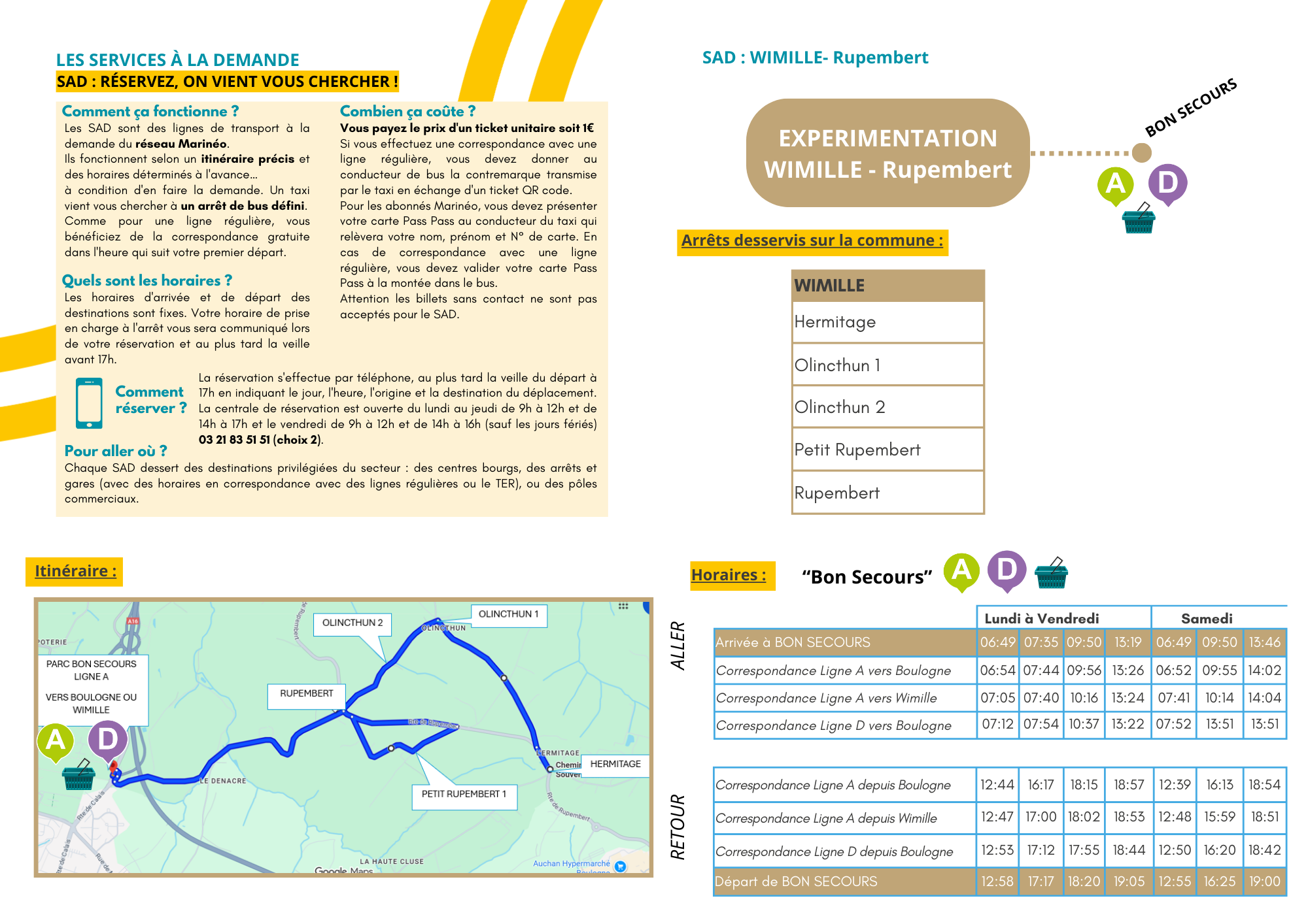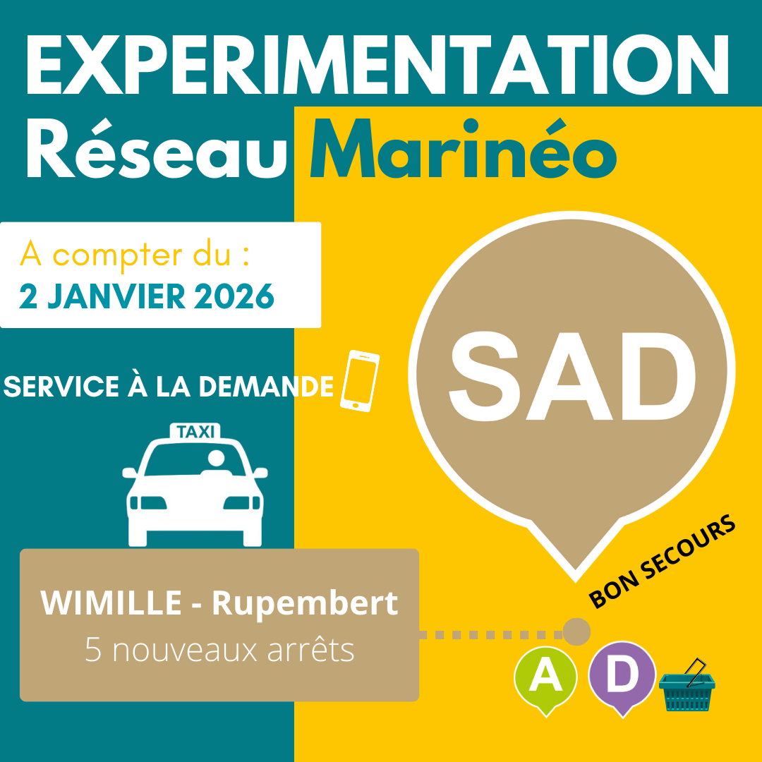Expérimentation SAD Wimille-Rupembert Janvier 2026 La Communauté d’Agglomération du Boulonnais et la Compagnie des Transports du Boulonnais vous informent d’une expérimentation du réseau Marinéo, à compter du 2 janvier 2026. Une ligne SAD (Service A la Demande) est créée pour desservir le hameau de Rupembert à Wimille. L’objectif étant de desservir ses habitants pour les emmener vers différentes destinations : Pour aller à l’école Pour aller travailler Pour aller faire ses courses Ou tout simplement se balader … 😊 Ce sont 5 nouveaux arrêts qui sont ainsi implantés dans ce hameau : « Hermitage », « Olincthun 1 », « Olincthun 2 », « Petit Rupembert » et « Rupembert » Cette ligne reliera l’arrêt « Bon secours » du réseau Marinéo où les habitants pourront prendre une correspondance avec les lignes A et D du réseau. Comment ça fonctionne ?