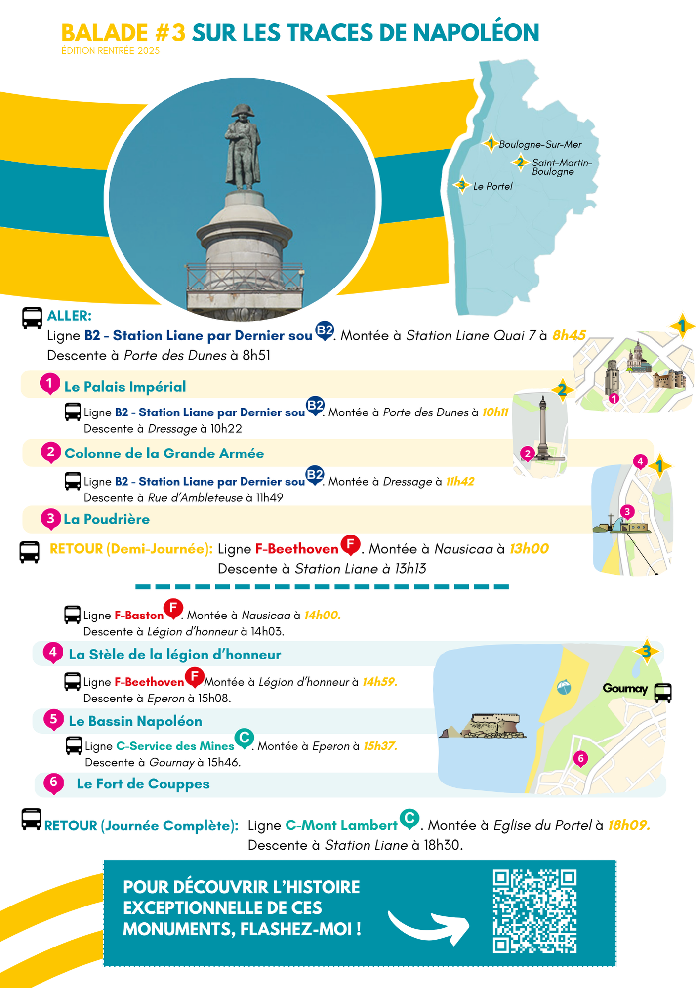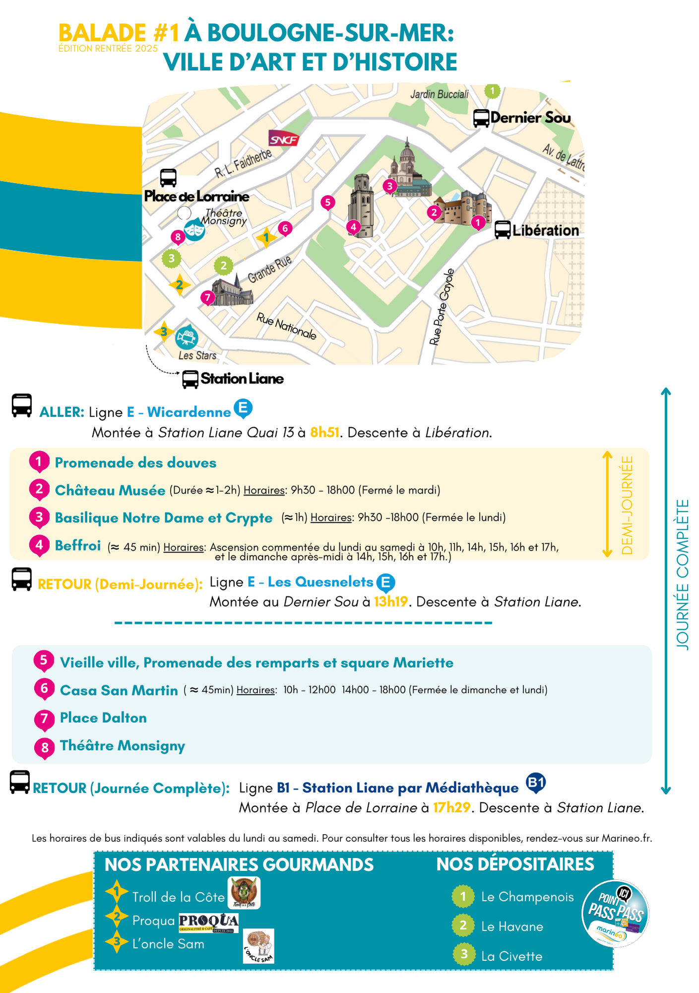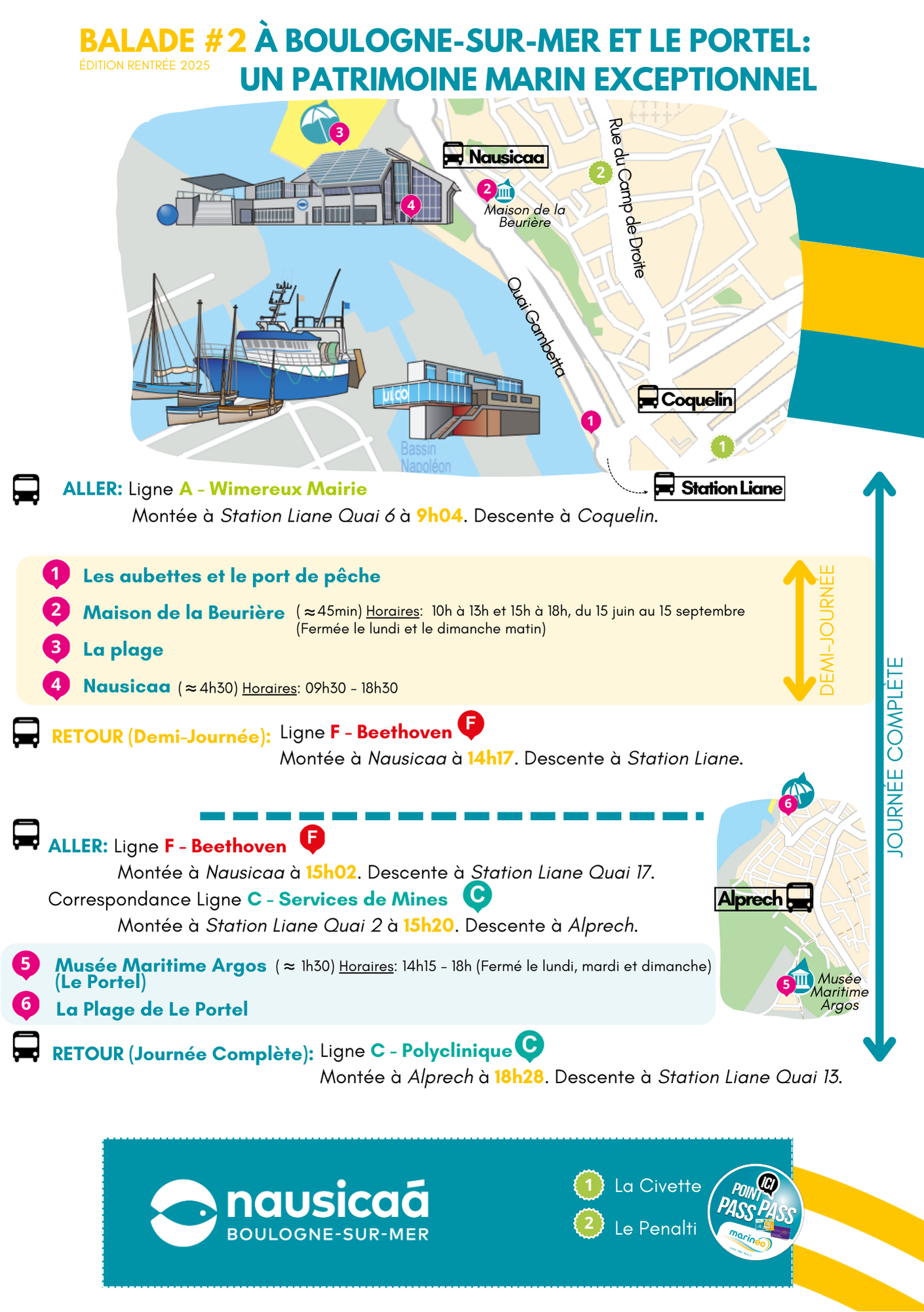 Chaque Bureau d’Information Touristique (Boulogne-sur-Mer, Equihen-Plage, Le Portel, Wimereux) a son propre parcours pour que les touristes puissent partir des communes balnéaires directement avec les lignes régulières du réseau Marinéo qui desservent ces communes.