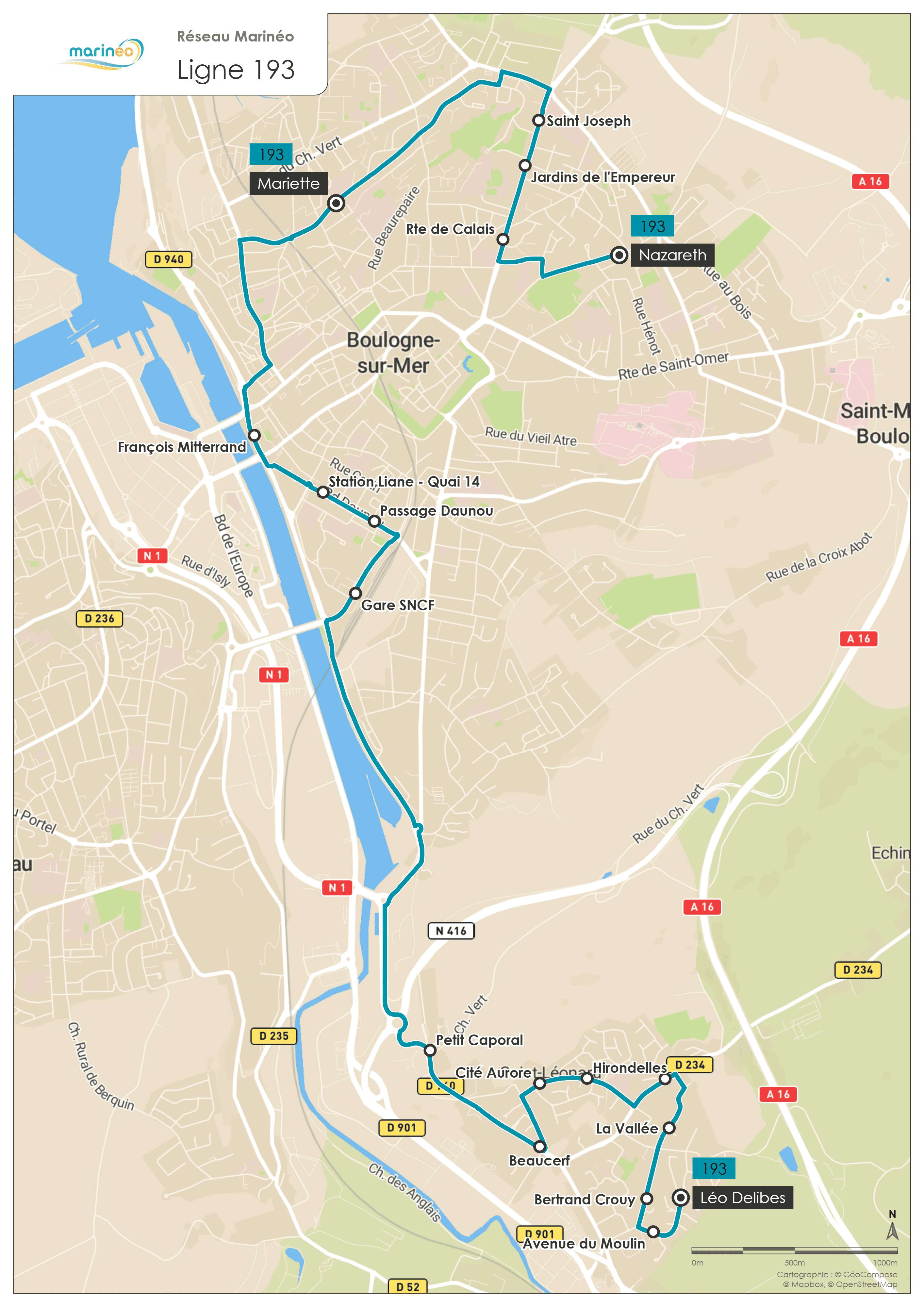 Line 193 - St Léonard Mariette- Haffreingue- St Joseph- Nazareth 193 LE SAVIEZ-VOUS ? Les lignes 16 à 210 de votre réseau de transport « Marinéo » sont accessibles à tous les usagers du réseau Marinéo et desservent l’ensemble des communes de l’agglomération boulonnaise, reliant écoles, quartiers, commerces, zones d’activités, lieux de loisirs et espaces naturels. Schedules Download the timetables for the school period (from September 1, 2025 to July 4, 2026 inclusive) Download Ligne 193-rentrée Sept 2025.pdf Served town(s) Saint-Léonard The line is running normally.