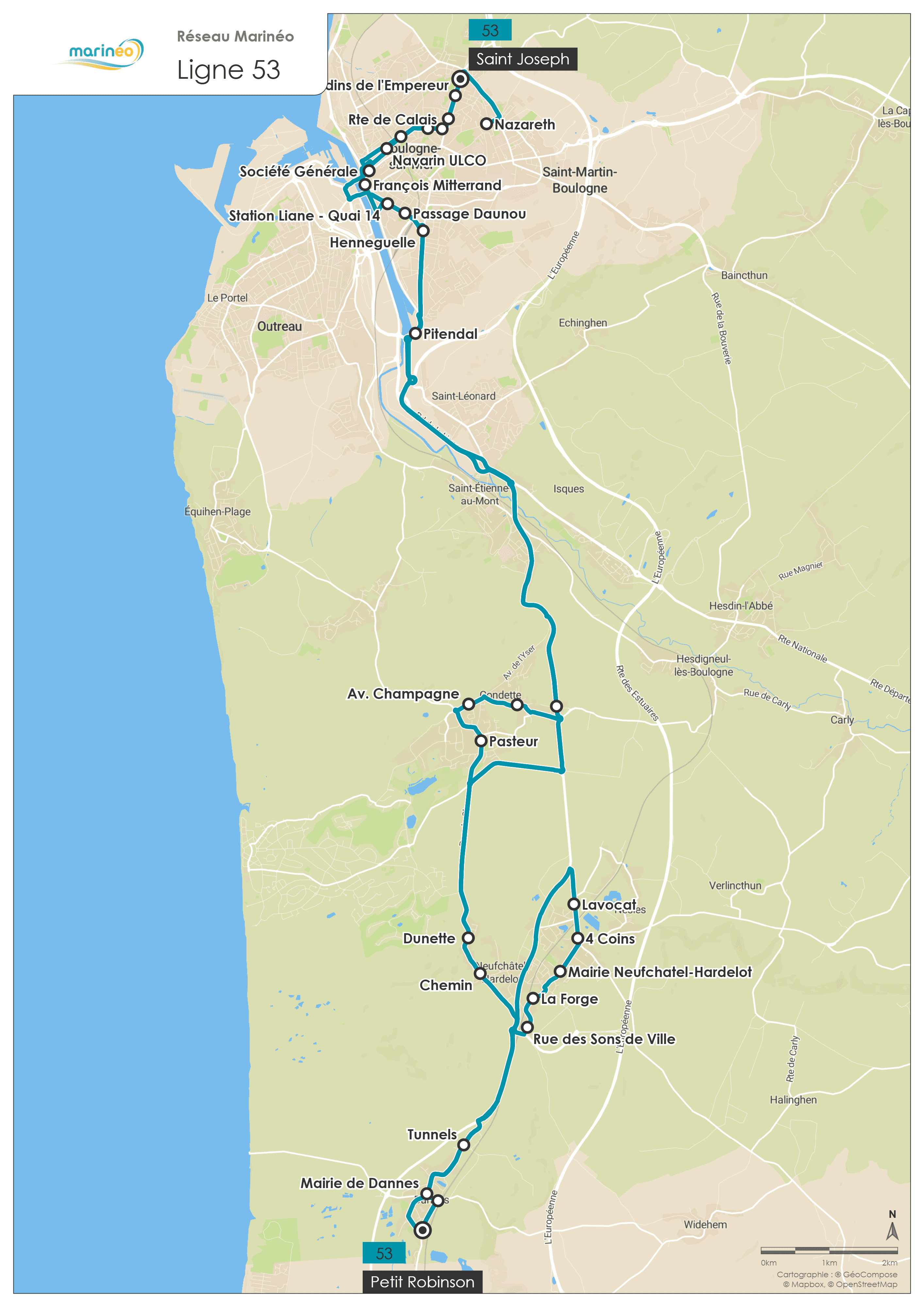 Line 53 - Dannes Mariette- Haffreingue- St Joseph- Nazareth 53 LE SAVIEZ-VOUS ? Les lignes 16 à 210 de votre réseau de transport « Marinéo » sont accessibles à tous les usagers du réseau Marinéo et desservent l’ensemble des communes de l’agglomération boulonnaise, reliant écoles, quartiers, commerces, zones d’activités, lieux de loisirs et espaces naturels. Schedules Download the timetables for the school period (from September 1, 2025 to July 4, 2026 inclusive) Download Ligne 53-rentrée Sept 2025.pdf Served town(s) Nesles Neufchâtel-Hardelot Dannes Condette The line is running normally.