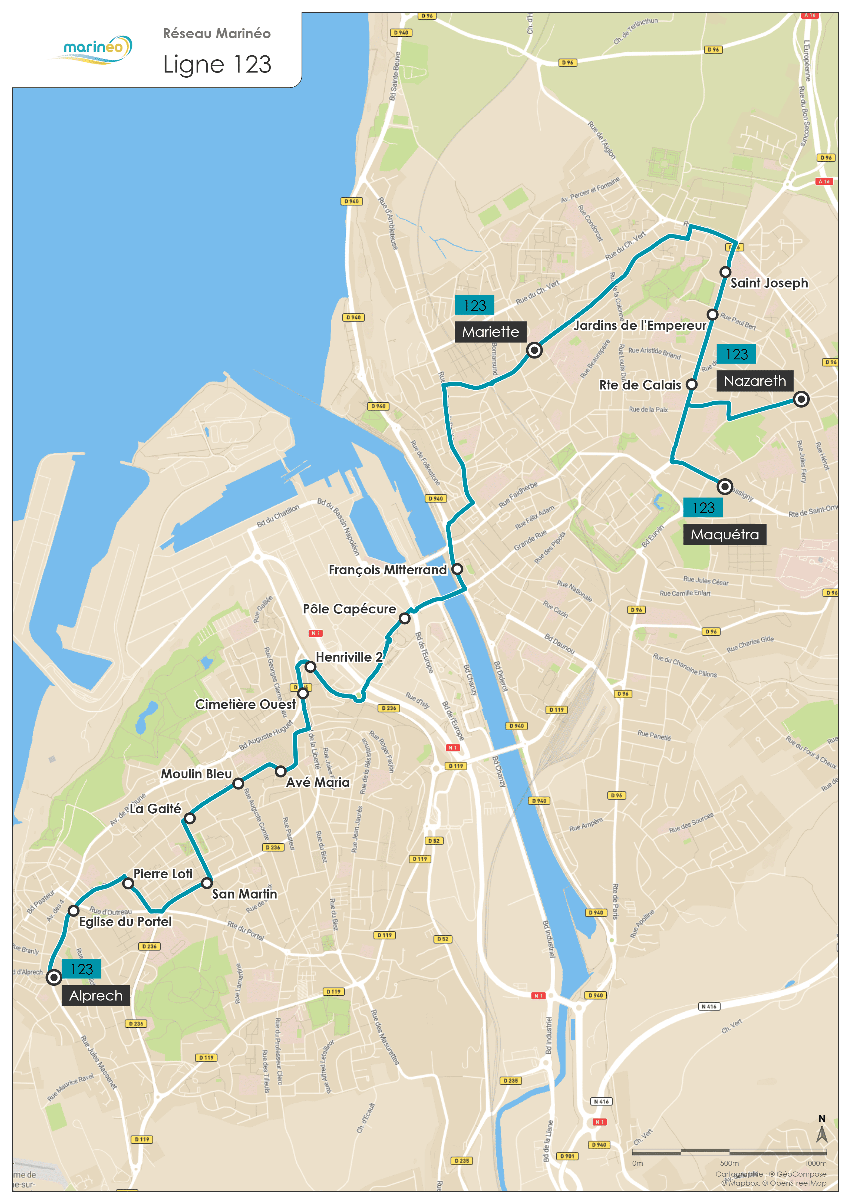 Ligne 123 - Le Portel Mariette- Haffreingue- St Joseph- Nazareth 123 LE SAVIEZ-VOUS ? Les lignes 16 à 210 de votre réseau de transport « Marinéo » sont accessibles à tous les usagers du réseau Marinéo et desservent l’ensemble des communes de l’agglomération boulonnaise, reliant écoles, quartiers, commerces, zones d’activités, lieux de loisirs et espaces naturels. Horaires Téléchargez les horaires pour la période scolaire (du 1er septembre 2025 au 9 novembre inclus) Télécharger Ligne 123-rentrée Sept 2025.pdf Téléchargez les horaires pour la période scolaire (du 10 novembre 2025 au 4 juillet 2026 inclus) Télécharger Ligne 123 - 10 novembre 2025.pdf Commune(s) desservie(s) Le Portel Arrêt déplacé TRAVAUX RUE TIHEN - LE PORTEL 123 128 Image En raison de travaux rue Tihen à Le Portel, l'arrêt Alprech (Terminus) sur les lignes H, 123 et 128 est reporté jusqu'à la fin des travaux. Arrêt reporté ou non desservis : Le terminus Alprech est reporté à l'arrêt Alprech situé sur le Boulevard du Général de Gaulle. Merci de votre compréhension Plus d'informations Autre effet OPTIMISATION RÉSEAU-LIGNES A et 123 123 Image OPTIMISATION RÉSEAU À COMPTER DU 10 NOVEMBRE 2025 : La Communauté d’Agglomération du Boulonnais et la Compagnie des Transports du Boulonnais vous informent d’une optimisation du réseau Marinéo, à compter du lundi 10 novembre prochain. Marinéo renforce son offre sur la ligne A vers Wimereux avec un doublage de la course depuis l' arrêt "Beethoven" au départ de 8h08 jusqu'à l'arrêt "Saint Joseph". La ligne 123 desservant les lycées et collèges Nazareth- Haffreingue effectuera son terminus à l'arrêt Maquétra. Retrouvez toutes les informations sur : marineo.fr Plus d'informations