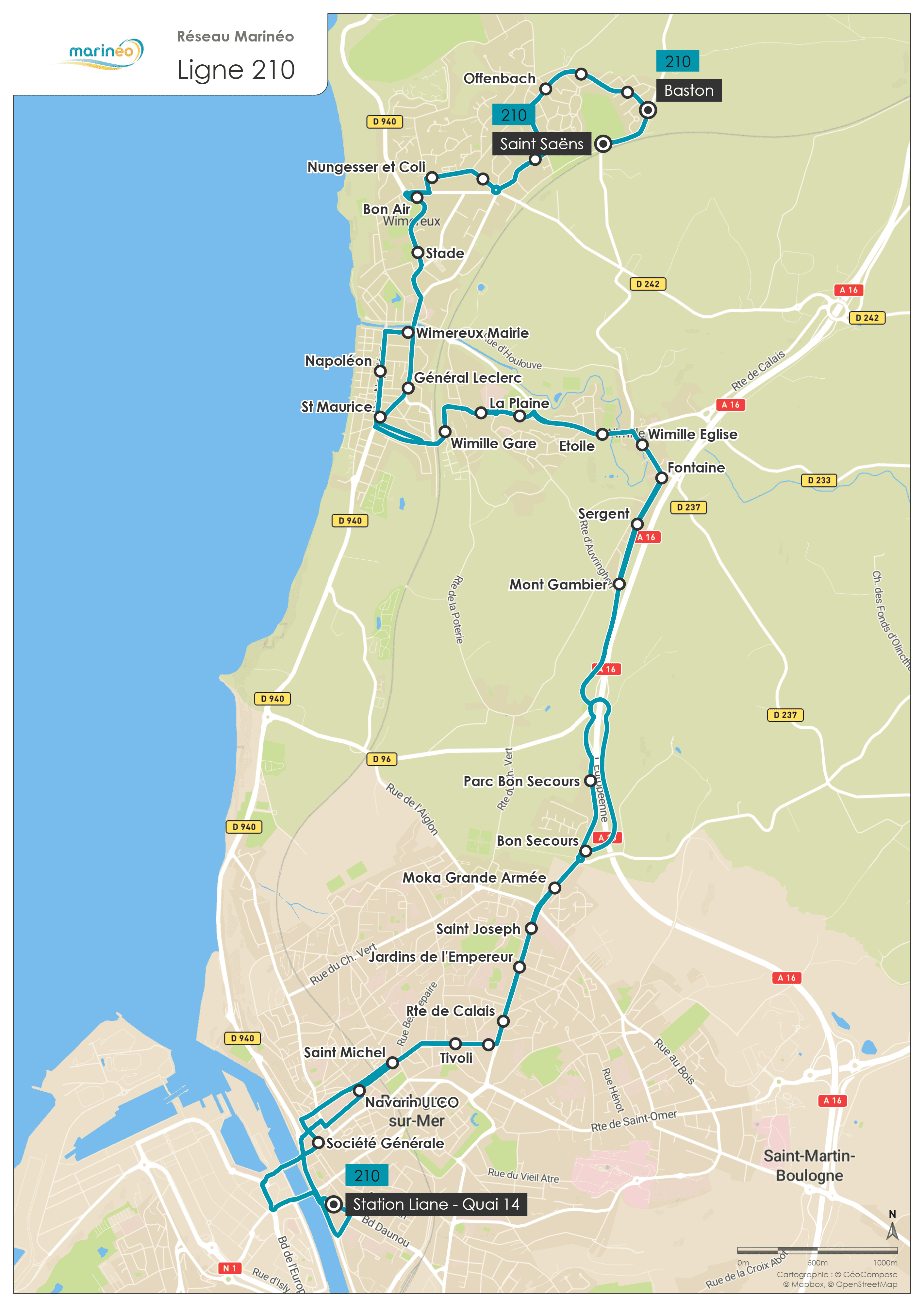 Ligne 210 - Wimereux Boulogne-sur-Mer 210 LE SAVIEZ-VOUS ? Les lignes 16 à 210 de votre réseau de transport « Marinéo » sont accessibles à tous les usagers du réseau Marinéo et desservent l’ensemble des communes de l’agglomération boulonnaise, reliant écoles, quartiers, commerces, zones d’activités, lieux de loisirs et espaces naturels. Horaires Téléchargez les horaires pour la période scolaire (du 1er septembre 2025 au 4 juillet 2026 inclus) Télécharger Ligne 210-rentrée Sept 2025.pdf Commune(s) desservie(s) Wimereux Wimille Déviation TRAVAUX RUE CARNOT - WIMEREUX 210 En raison de travaux rue Carnot à Wimereux, la ligne 210 sera déviée à partir du 7 octobre jusqu'à la fin des travaux . Arrêts reportés ou non desservis : Ligne 210 Vers Equihen Plage : « WIMILLE GARE » - « WIMEREUX MAIRIE » - « NAPOLEON » SONT REPORTES A L’ARRET PROVISOIRE LIGNE 210, DEMI-TOUR À LA GARE DE WIMILLE Ligne 210 vers Wimereux : « SAINT MAURICE » - « GENERAL DE GAULLE » NON DESSERVIS « WIMEREUX MAIRIE » REPORTE ARRET PROVISOIRE LIGNE 210, DEMI-TOUR À LA GARE DE WIMILLE Plus d'informations