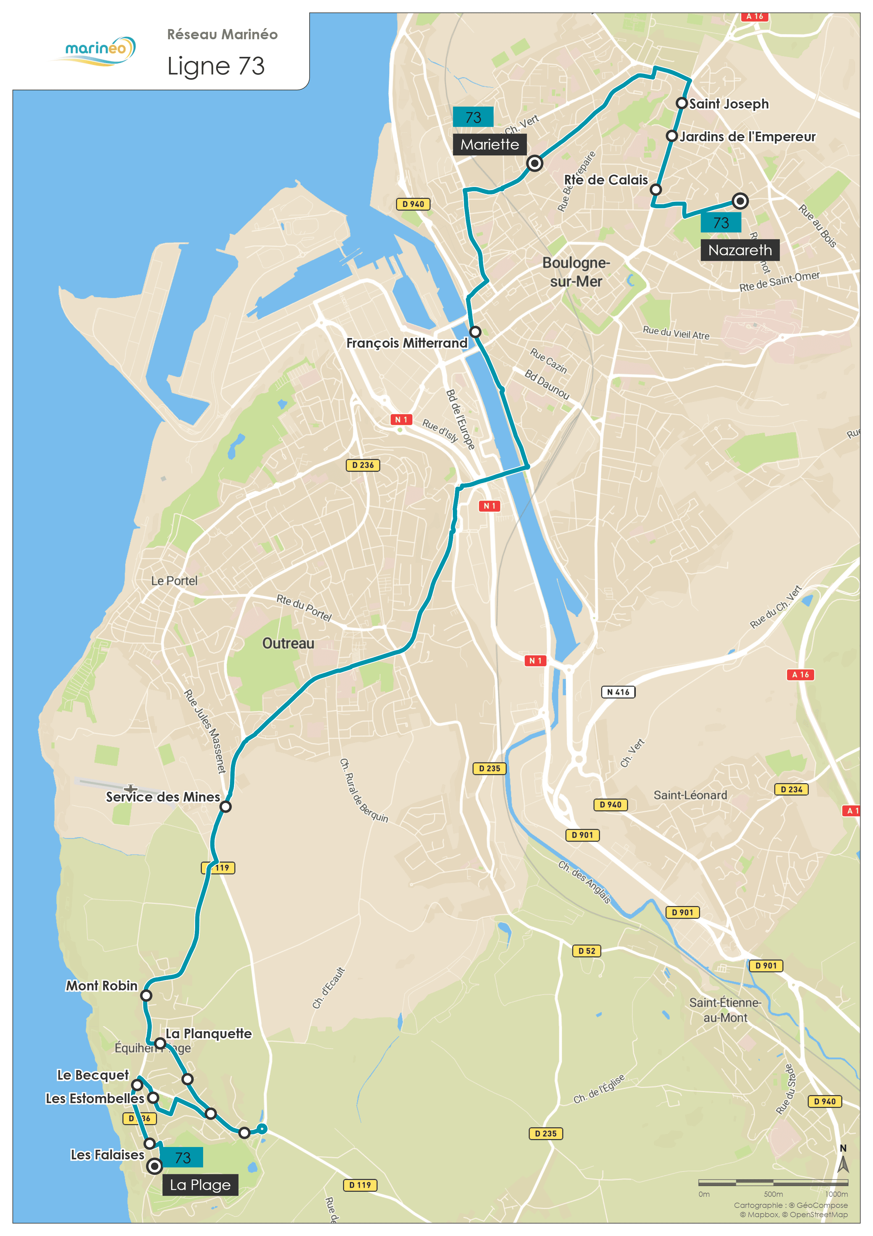 Ligne 73 - Equihen-Plage Mariette- Haffreingue- St Joseph- Nazareth 73 LE SAVIEZ-VOUS ? Les lignes 16 à 210 de votre réseau de transport « Marinéo » sont accessibles à tous les usagers du réseau Marinéo et desservent l’ensemble des communes de l’agglomération boulonnaise, reliant écoles, quartiers, commerces, zones d’activités, lieux de loisirs et espaces naturels. Horaires Téléchargez les horaires pour la période scolaire (du 1er septembre 2025 au 4 juillet 2026 inclus) Télécharger Ligne 73-rentrée Sept 2025.pdf Commune(s) desservie(s) Equihen-Plage Déviation TRAVAUX RUE DE LA COLONNE – BOULOGNE SUR MER 123 153 183 193 73 83 Image En raison des travaux rue de la Colonne à Boulogne, les lignes K1, 73, 83, 123, 153, 183 et 193 seront déviées ce 26 novembre jusqu'à la fin des travaux. Arrêts reportés ou non desservis : Ligne K1 : « LOUIS DUFLOS » REPORTE A « TIVOLI » « BEAUREPAIRE » NON DESSERVI « NORMANDIE » REPORTE A « ST PATRICK » « CALMETTE » REPORTE A « DUGAND BUCAILLE » Lignes 73, 83, 123, 153, 183 et 193 : « MARIETTE » REPORTE A L’ANCIEN ARRET « TRANSITION » Merci de votre compréhension Plus d'informations