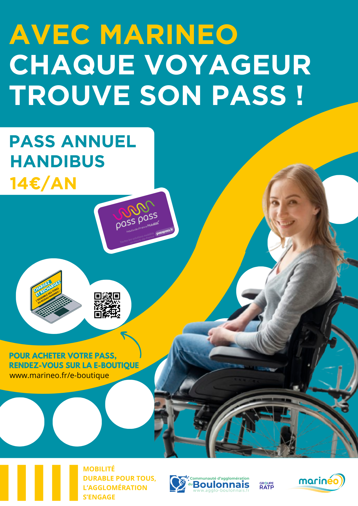 Le Pass'Annuel Handibus Accompagnateur vous permet d'être accompagné, par la personne de votre choix, lors de vos voyages sur le réseau Marinéo pour voyager en illimité sur le réseau du 1er janvier au 31 décembre.